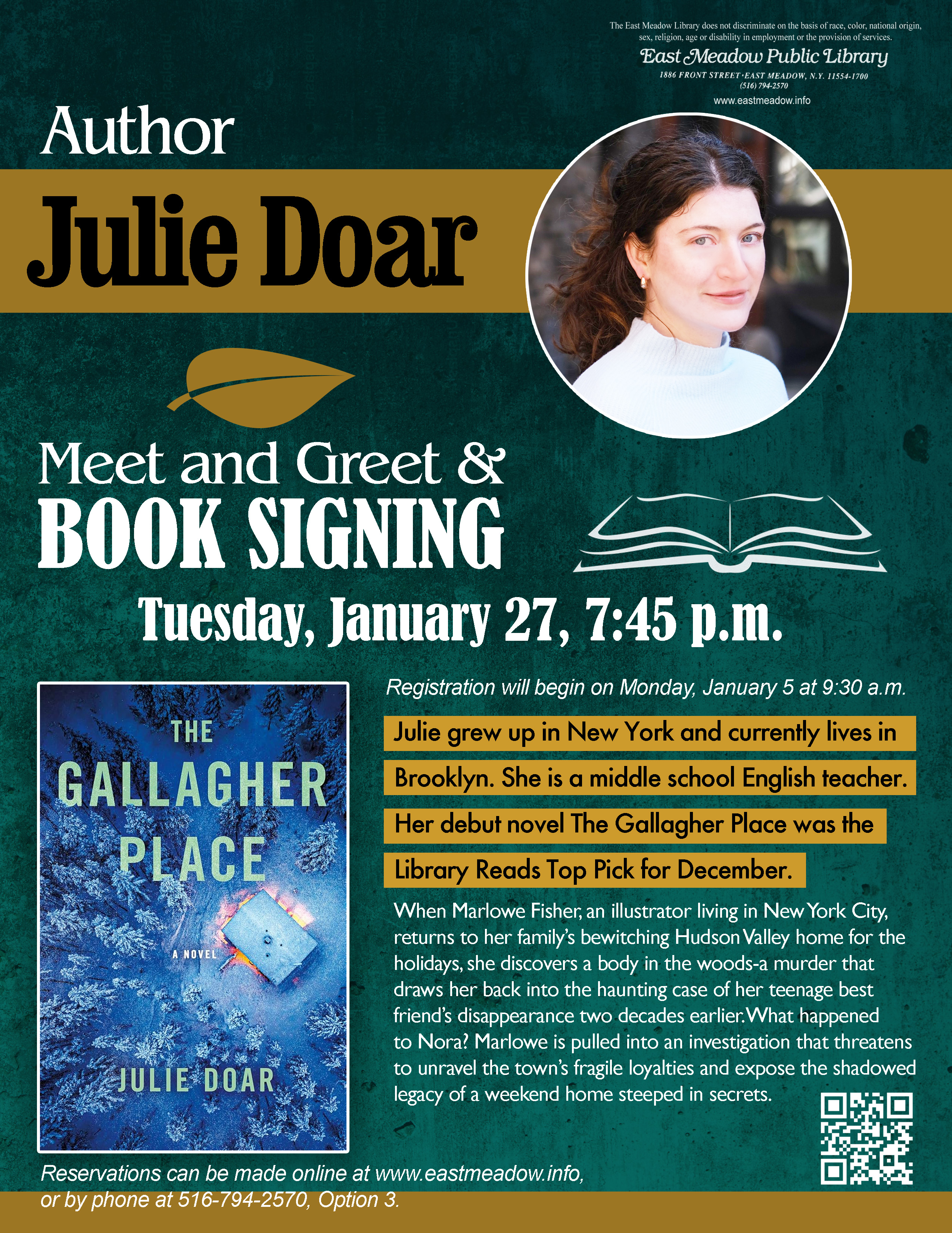 The East Meadow Public Library is excited and honored to have Julie Doar discuss her debut novel, The Gallagher Place, which was the Library Reads Top Pick for December. This chilling story is a layered exploration of family secrets, sibling misconceptions, and an unsolved murder set in New York’s Dutchess County. Julie will be signing copies of her book which will be for sale after the program.